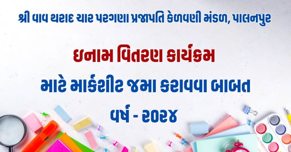વર્ષ ૨૦૨૪ ઇનામ વિતરણ કાર્યક્રમ માટે માર્કશીટ જમા કરાવવા બાબત- શ્રી વાવ થરાદ ચાર પરગણા પ્રજાપતિ કેળવણી મંડળ, પાલનપુર